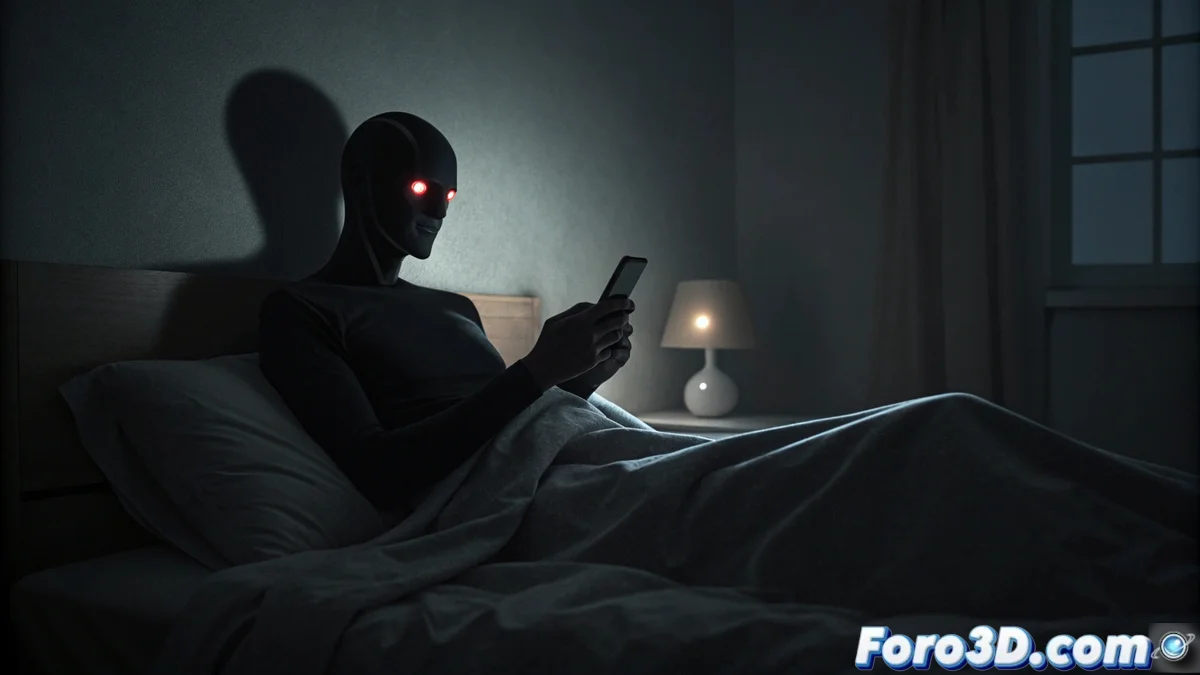 Abre Blender y borra el cubo inicial. Modela o importa una habitación simple con una cama. Añade un plano para representar a la persona acostada, quizá sosteniendo un teléfono móvil. Coloca una cámara que encuadre a la persona en primer plano, dejando un espacio vacío en una esquina del fondo. La iluminación debe ser tenue, simulando la luz de un dispositivo móvil o una lámpara de noche.