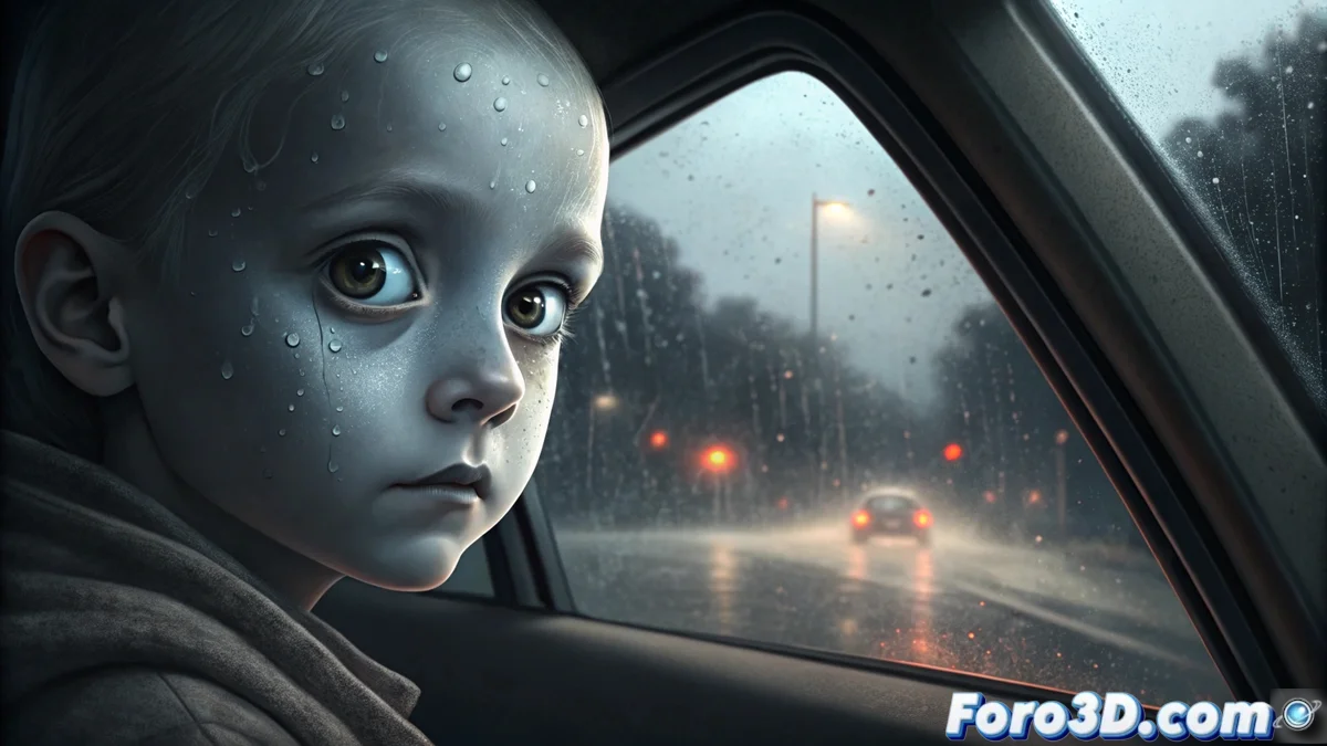 La leyenda urbana de los niños de ojos negros narra encuentros nocturnos con menores que piden entrar a un vehículo o vivienda. Su rasgo más distintivo son sus ojos completamente negros, sin iris ni blanco visible, lo que provoca una sensación de terror intenso e irracional en quien los ve. Esta escena busca capturar ese momento de tensión desde una perspectiva subjetiva.