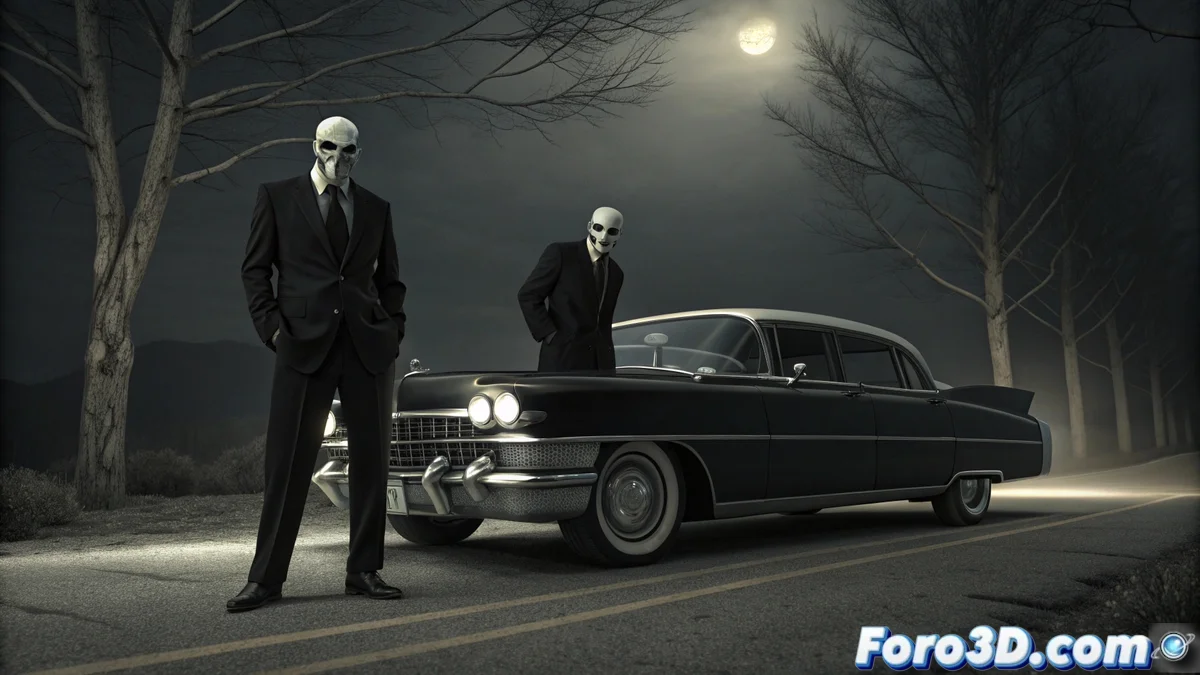 El folclore OVNI describe a los Hombres de Negro como figuras siniestras que preceden a las películas. Se presentan como seres de aspecto extraño, con piel pálida y un comportamiento robótico. Suelen conducir coches negros antiguos y su misión es amenazar a los testigos de avistamientos para que guarden silencio. Esta escena busca capturar esa esencia ominosa y retro.