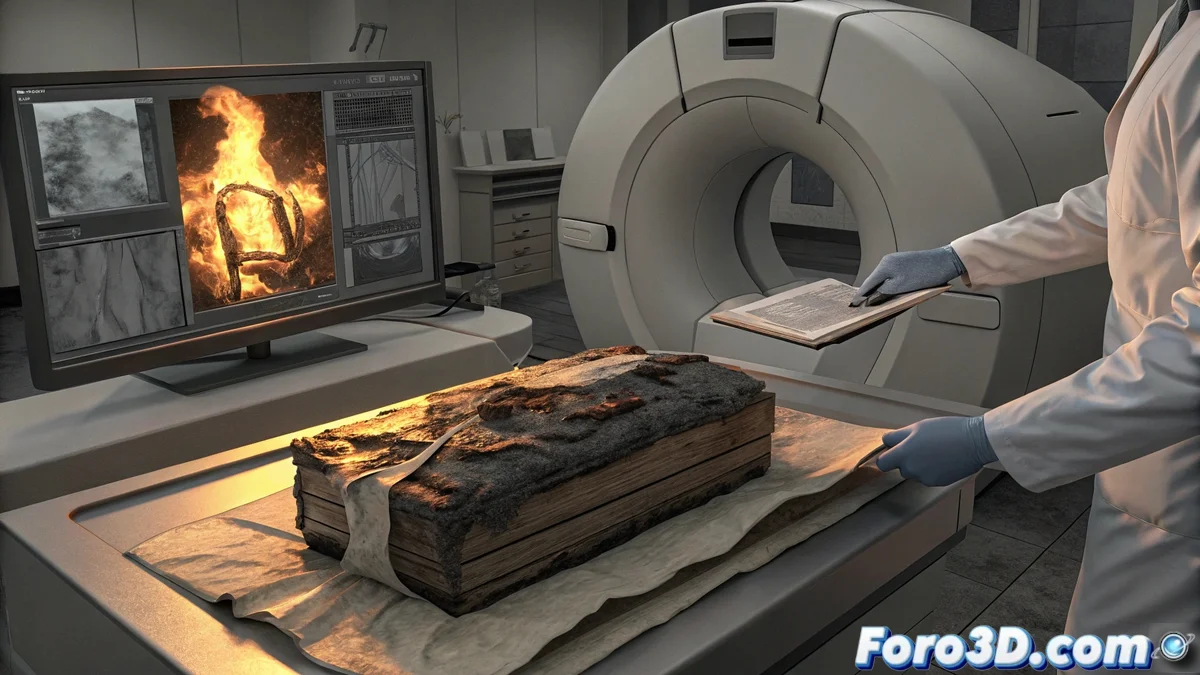 La policía recupera un bloque de documentos carbonizados tras un incendio. Este bloque es tan frágil que manipularlo físicamente lo destruiría. Para evitar eso, los investigadores escanean el objeto completo con un tomógrafo computarizado, como los que se usan en medicina. Este escáner, a menudo un modelo de Nikon CT, genera un volumen digital en 3D del bloque quemado sin tocarlo. Así se preserva la evidencia en su estado original.