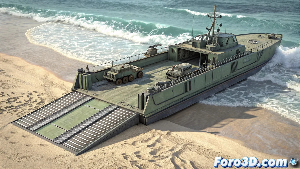 Para defensa, la embarcación monta dos afustes para ametralladoras pesadas de 12.7 mm. Estos suelen ubicarse en las alas del puente de mando. Al texturizar, es importante considerar el esquema de pintura naval estándar y los detalles de uso operativo, como pasarelas, barandillas y puntos de amarre. El resultado es un vehículo anfibio con una función muy específica y una geometría compleja que representa un reto interesante para modelar.