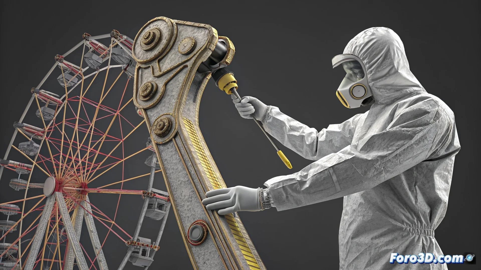 Los ingenieros forenses analizan la fractura del brazo de una atracción de feria. El fallo se produce por fatiga del metal, un proceso donde las grietas crecen lentamente bajo cargas cíclicas. Para investigar, se escanea en 3D la superficie de la fractura con un escáner industrial GOM ATOS Q. Este equipo captura con precisión la topografía completa, incluyendo las marcas de playa y las estrías microscópicas que deja la grieta al propagarse.