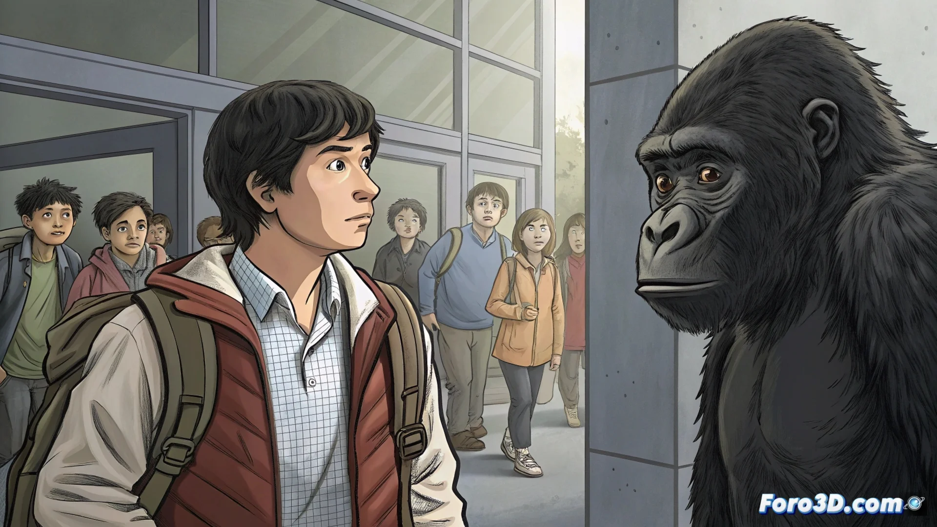 La historia avanza mediante escenas auto-conclusivas que priorizan el chiste sobre una trama lineal. El humor nace del choque entre la presentación visual, que toma en serio a sus personajes, y sus acciones, que son completamente ilógicas. Este enfoque convierte lo mundano, como esperar el tren o estudiar para un examen, en eventos surrealistas. La obra no explica sus premisas, como la presencia del gorila, y las trata con total normalidad dentro de su universo.
