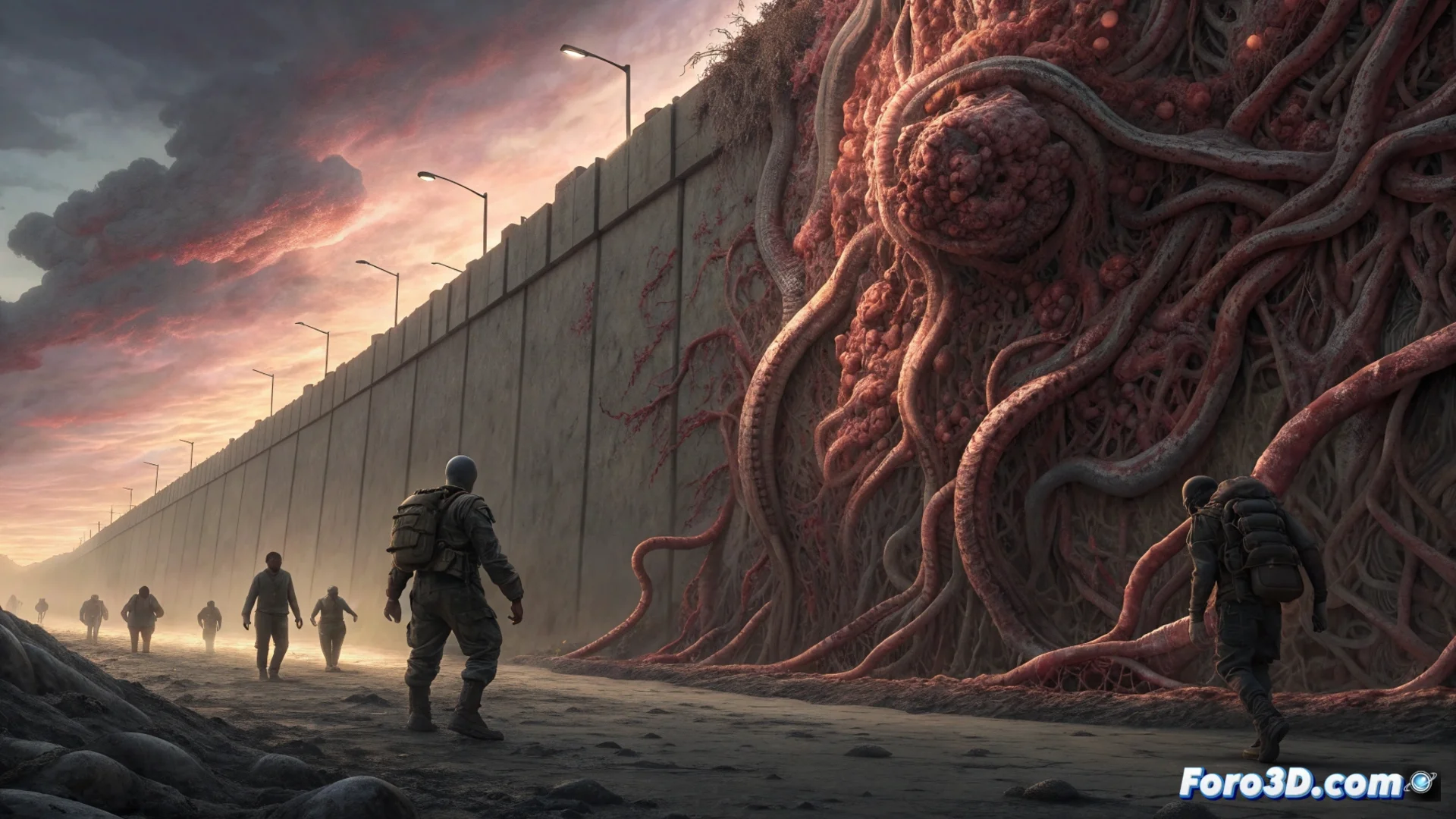 Durante una inspección de rutina, un sector del muro detecta una fisura. Al instante, la carne viva reacciona. Zarcillos gruesos como troncos, recubiertos de un caparazón brillante, se despliegan desde la grieta como tentáculos. Atrapan con fuerza las siluetas de varios bárbaros que intentaban escapar. Los guardias observan, impasibles, mientras la muralla absorbe a los capturados, integrándolos en su biomasa para reparar la herida. El proceso es silencioso, solo interrumpido por el zumbido de los exoesqueletos y el latido sordo del muro.