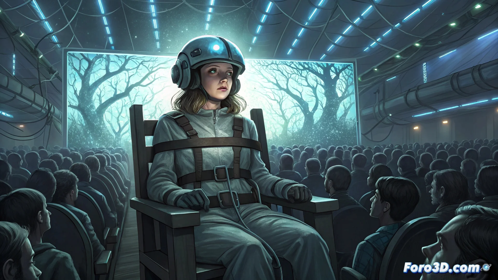 La escena se desarrolla en un auditorio futurista y frío. La acusada, una mujer joven, está inmovilizada en una silla metálica. Un casco de electrodos cubre su cabeza. Un holograma gigante muestra fragmentos de su vida interior: recuerdos de un bosque sin conexión, pensamientos críticos sobre el sistema y momentos de silencio mental. Cada imagen privada que se proyecta recibe un veredicto inmediato de la audiencia, cuyo rostro colectivo se ilumina al unísono con la luz de sus dispositivos, mostrando aprobación o rechazo según lo que indica su feed.