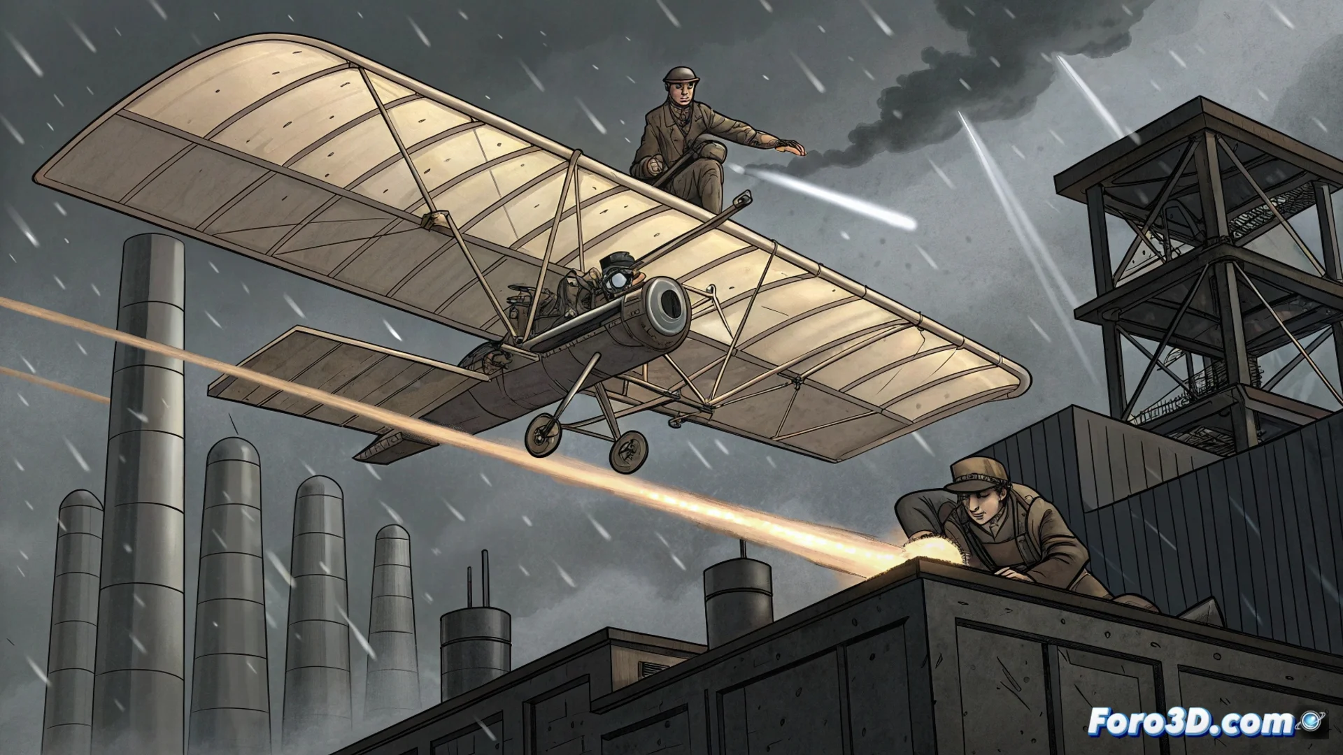 En un sector industrial gris y lluvioso, dos hermanos renegados ajustan los últimos cables de su planeador casero. El artefacto, construido con piezas robadas y desechos reciclados, chirría bajo el viento frío. Uno de los hermanos se sube a la estructura de madera y tela mientras el otro sujeta una cuerda. Con un empujón final, el planeador despega del suelo lodoso y comienza a ascender, desafiando la gravedad y todas las normas.