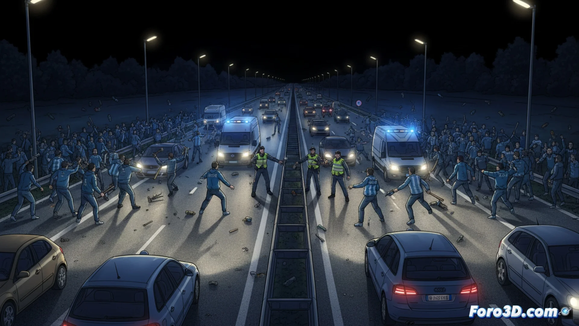 Los grupos se cruzan en la autopista porque unos se dirigen a Turín, donde el Napoli juega contra la Juventus, y otros regresan de Lecce, donde la Lazio ha jugado un partido. Este encuentro fortuito en la carretera desata la violencia que paraliza brevemente una de las principales vías de comunicación del país. Las autoridades logran restablecer el orden y el tráfico continúa después de la intervención.