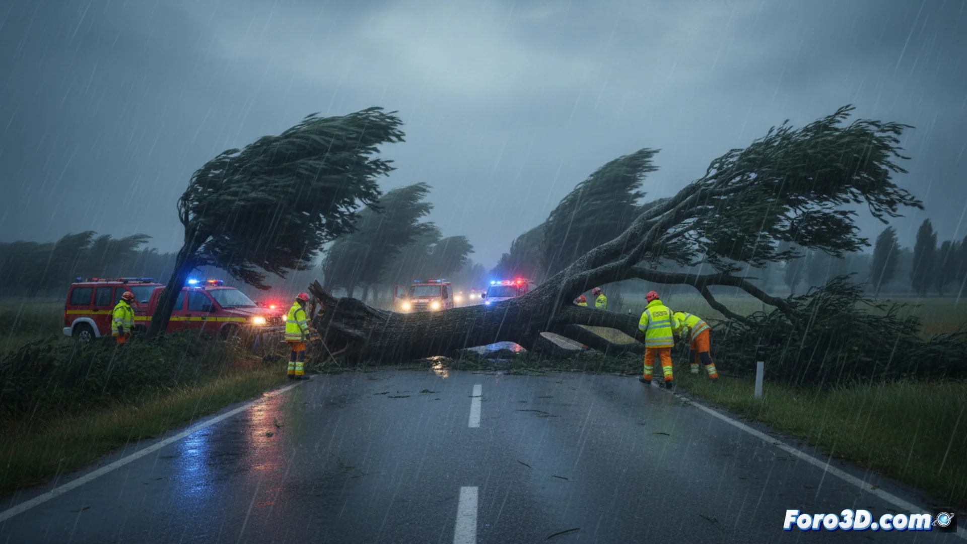 Mientras algunos buscan refugio, los árboles parecen decidir que es un buen momento para tumbarse a descansar en medio de la calzada.