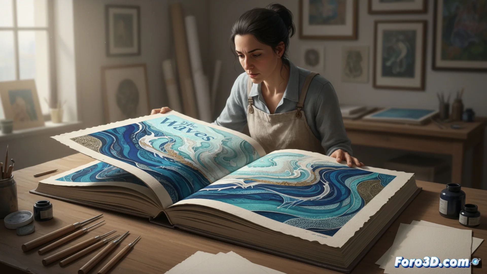 El proyecto de Claudia Torre parte de la novela Las olas de Virginia Woolf. La artista no se limita a ilustrar el texto, sino que construye un diálogo plástico con él. Utiliza técnicas de grabado y collage para evocar el fluir de la conciencia y el paso del tiempo, temas centrales en la obra de la escritora británica. El resultado es un libro único donde cada página es una pieza que invita a leer y a mirar de forma simultánea.