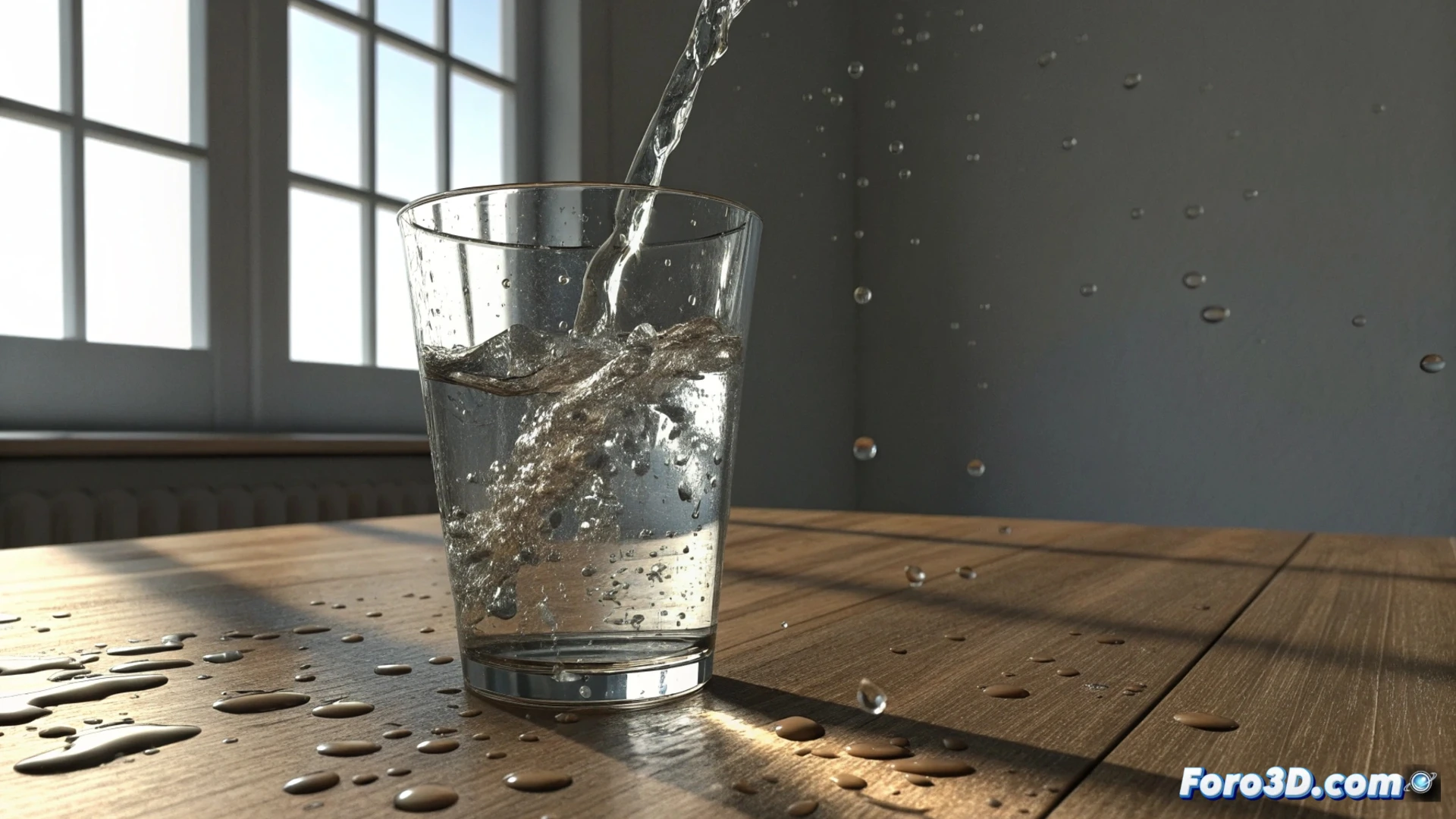 La clave para que el agua se perciba real está en los materiales y la iluminación. Usa un material Glass con un índice de refracción de 1.33, algo de turbidez y un color azul o verde muy tenue. Añade un Environment con un HDRI para obtener reflejos realistas y considera usar Caustics en el render para simular cómo la luz se distorsiona al pasar por el líquido en movimiento.