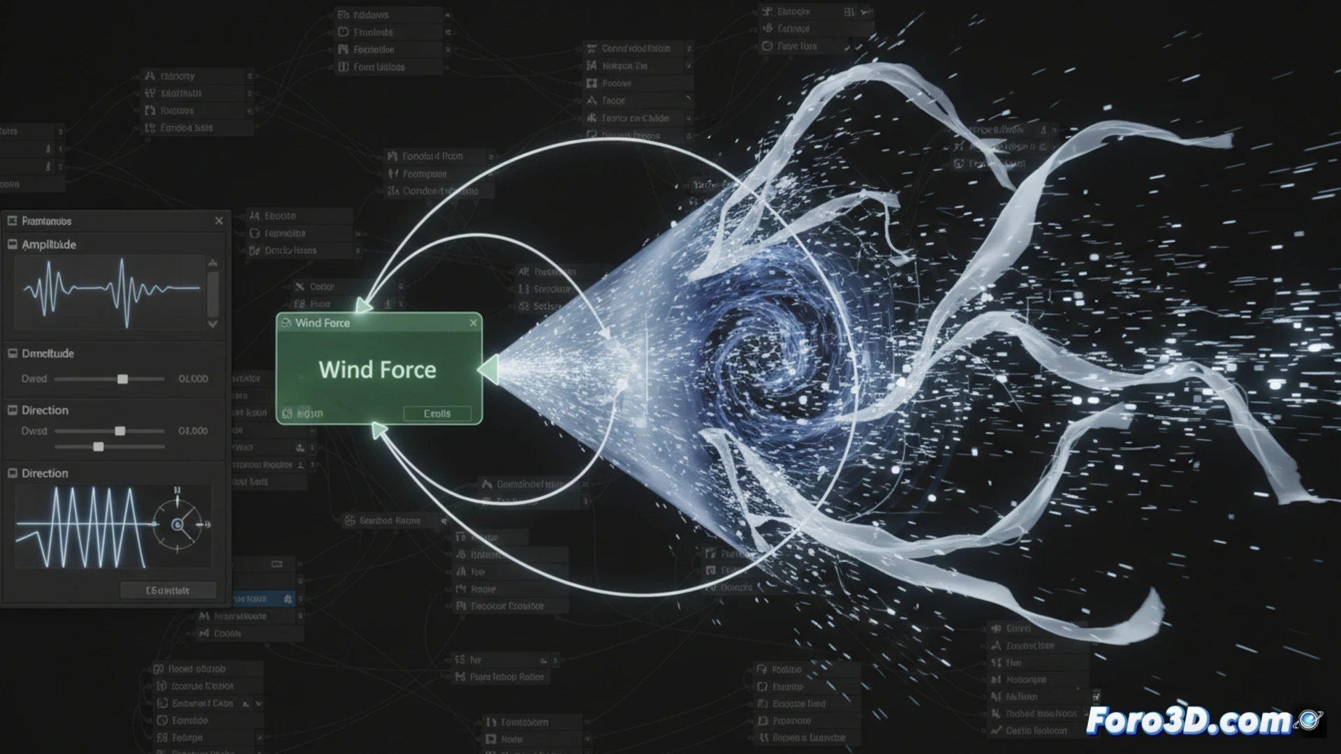 Para que la dirección también cambie, se modifica el campo Direction del viento. Se puede crear un vector a partir de dos o tres canales de ruido independientes, normalizarlo y multiplicarlo por la intensidad variable. Integrar este sistema en un SOP Solver dentro de una simulación DOP permite que el viento racheado interactúe con geometría deformable a lo largo del tiempo, actualizando la fuerza en cada fotograma.