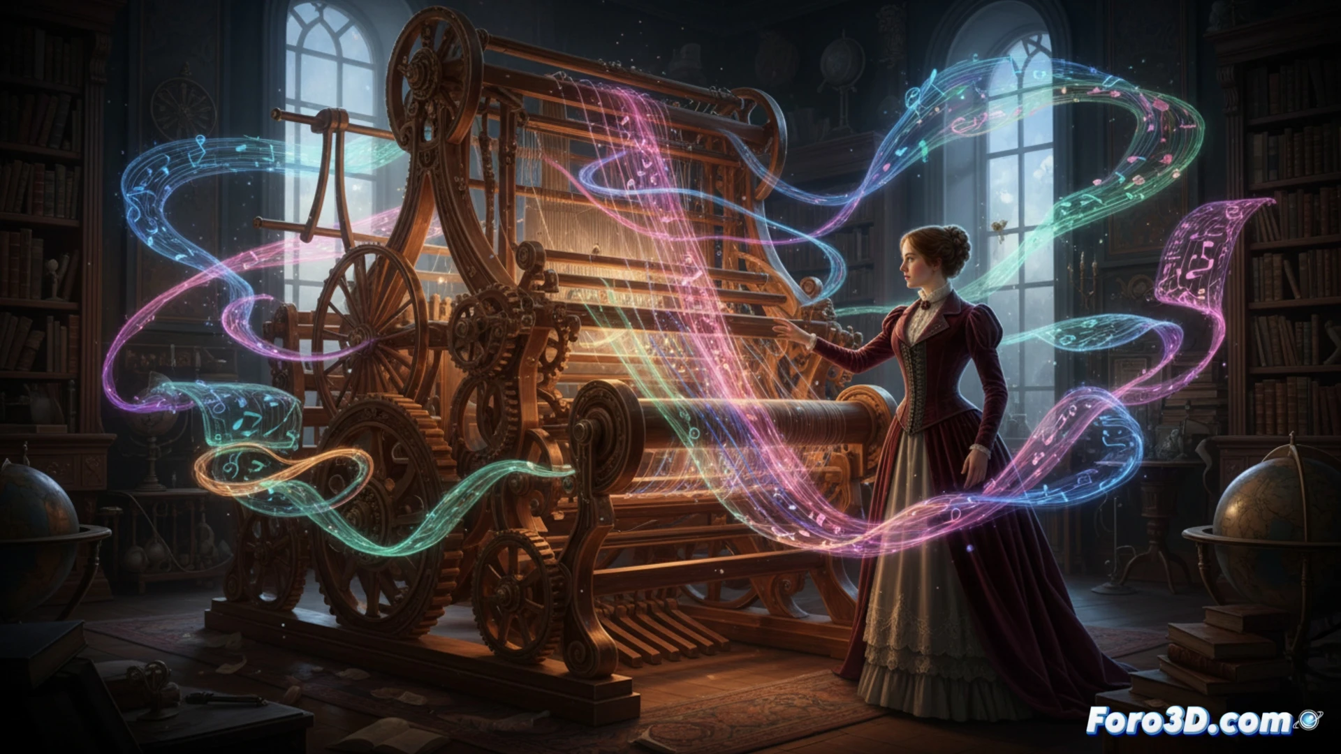 El núcleo narrativo y visual reside en cómo se muestran los algoritmos que Ada escribe. Cada instrucción, cada bucle y cada variable se convierte en un hilo de luz de un color específico. Estos hilos danzan y se entrelazan en el telar de la máquina, tejiendo patrones complejos. Estos patrones no solo resuelven cálculos, sino que también generan música, arte visual e incluso poesía, mostrando el potencial artístico que Ada intuyó en la programación.