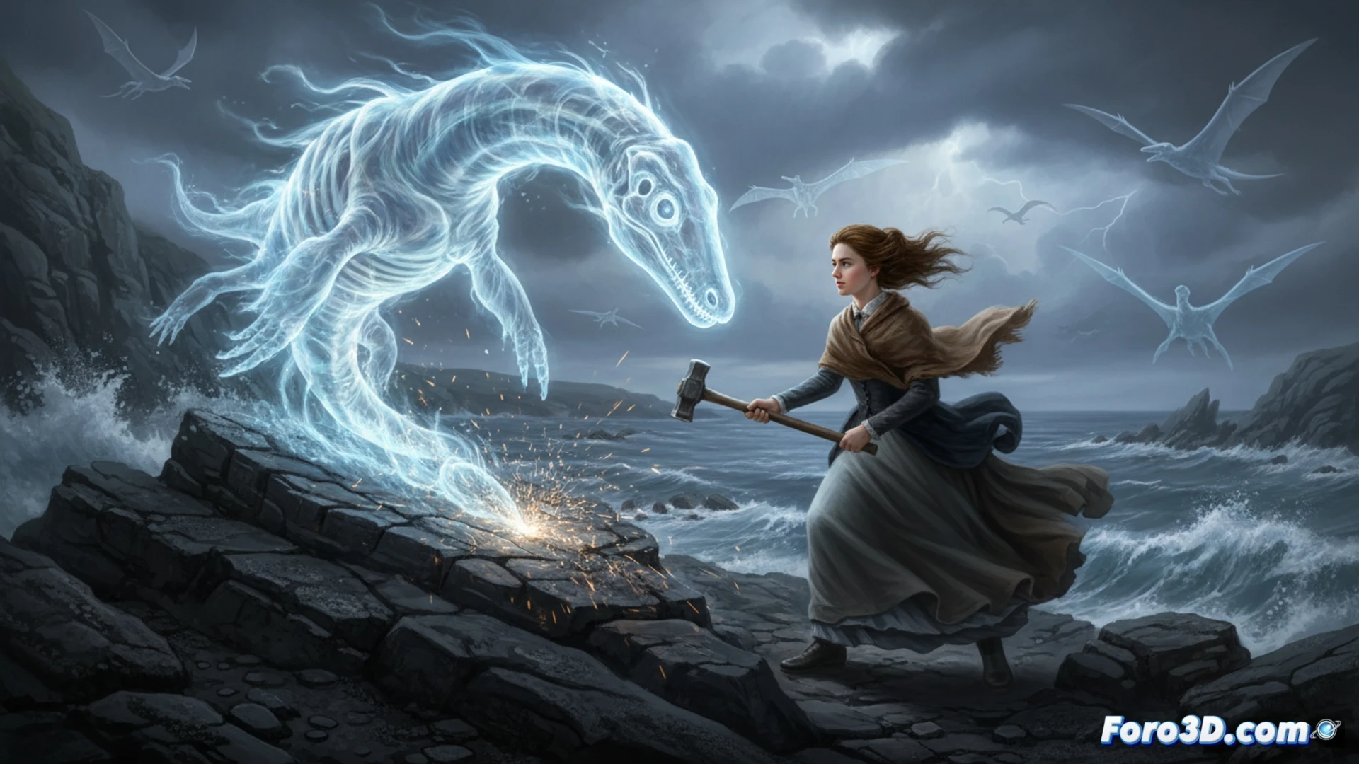Esta sinopsis propone una película de animación 3D que mezcla historia y fantasía. Se centra en Mary Anning, una paleontóloga real, pero le da un giro sobrenatural. En lugar de solo extraer fósiles, ella libera los espíritus de las criaturas prehistóricas que descubre. Estos aparecen como espectros luminiscentes y colosales a su lado, narrando cómo era el mundo en el que vivieron. La premisa convierte el trabajo científico en una aventura fantástica y personal.
