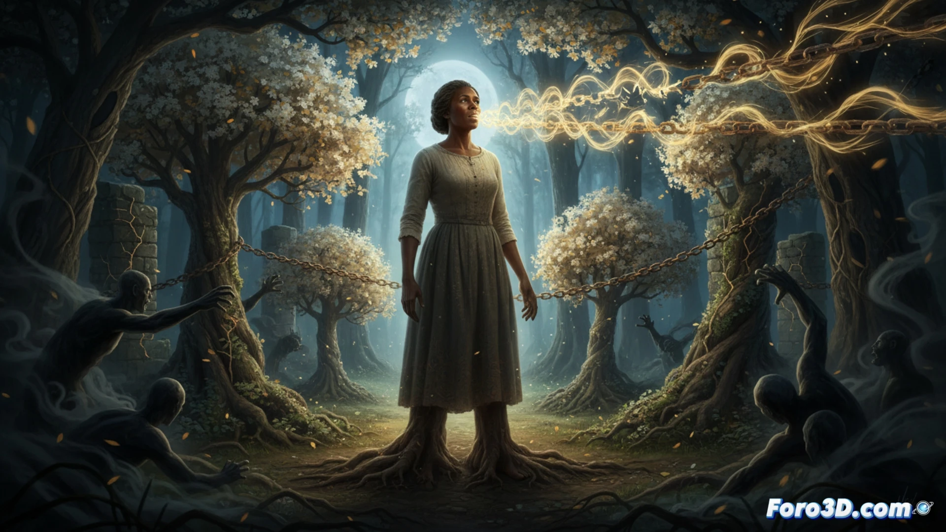 Esta sinopsis de animación 3D presenta a Sojourner Truth como una figura de estatura gigante y naturaleza gentil. Su voz posee un poder físico tangible que le permite hacer crecer raíces bajo sus pies y hacer florecer árboles a su alrededor. El concepto visual central muestra cómo escapa de las sombras de la esclavitud, entidades que intentan silenciarla y encadenarla de nuevo. Su viaje por el país se plasma como un camino de luz que deja a su paso, un rastro luminoso que contrasta con la oscuridad que persigue.