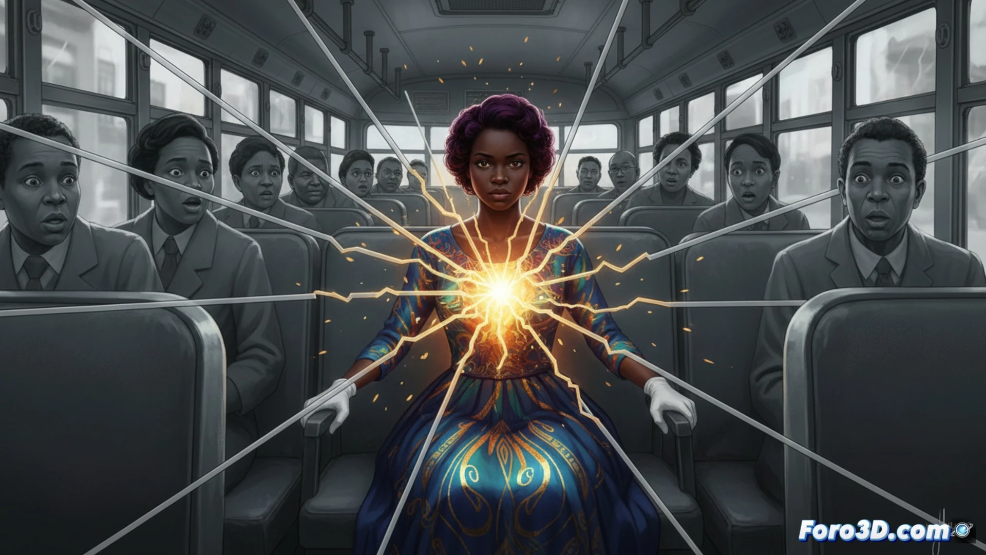 Claudette se aferra a su asiento y se niega a ceder. De su corazón emana una luz cálida y desafiante que agrieta las líneas invisibles que la constriñen. Este acto de resistencia no solo le permite mantener su posición, sino que también muestra a los demás que esas barreras pueden romperse.