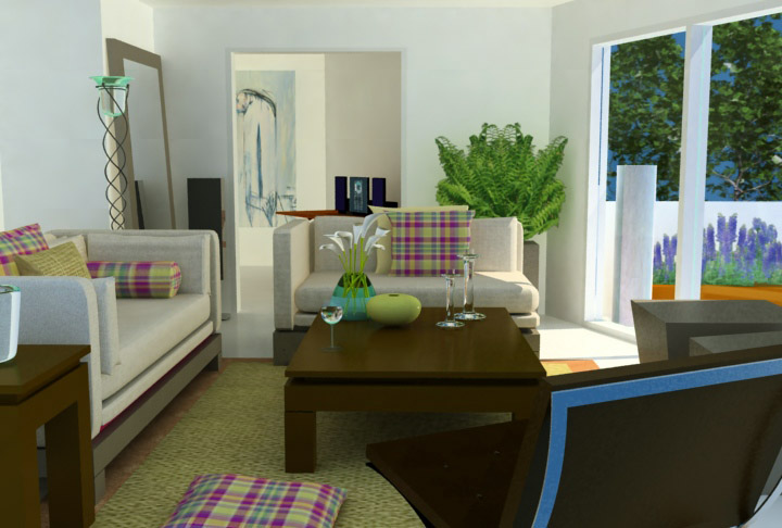 El render está bastante bien, pero me pensaría hacer una composición en Adobe Photoshop para cambiar lo que se ve a través de la ventana.