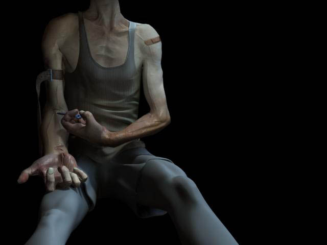 Otro detalle importante, para cuando avances, es presentar las venas que se vean con muchos nudos y señales de pinchazos, indicando así hasta dónde llega la dependencia. Saludos.