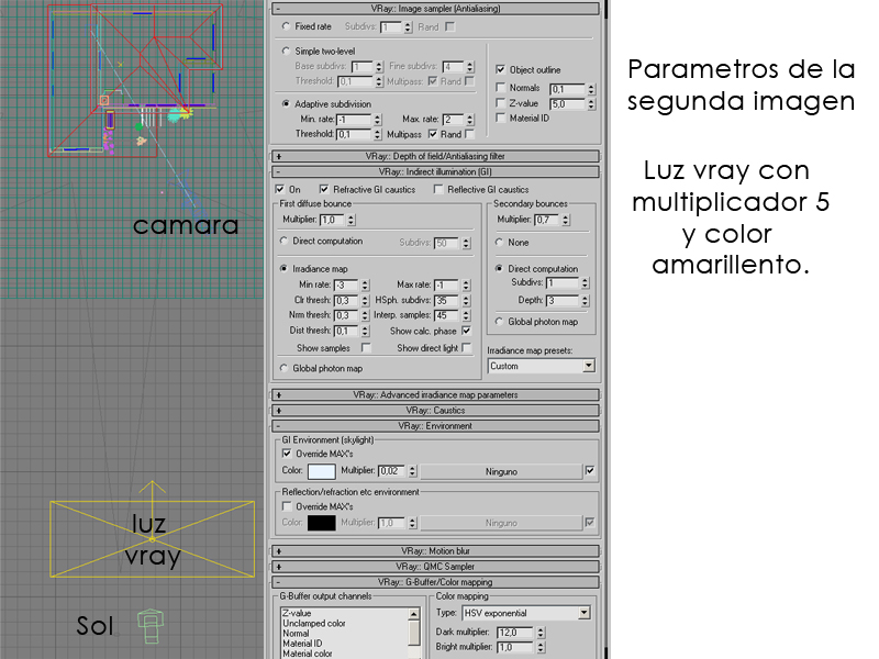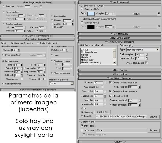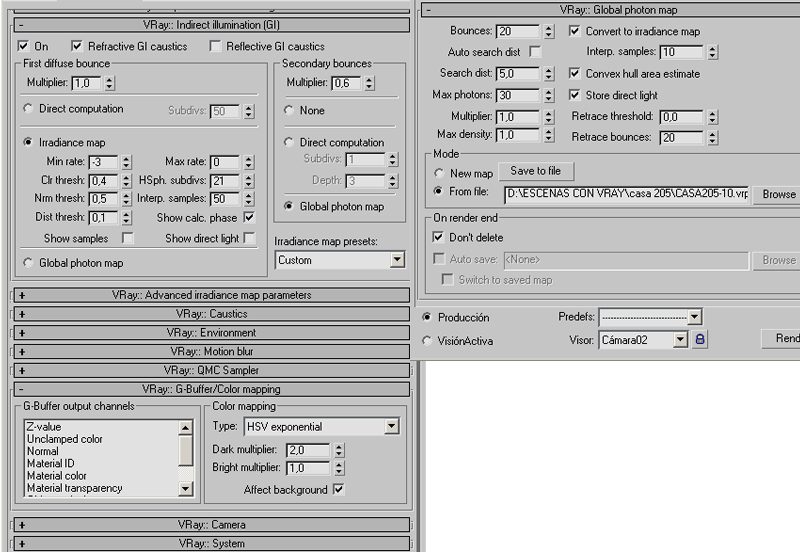 Bueno, yo te puedo dar un par de consejos, mis humildes conocimientos de Vray que tengo, igual te sirven de algo: Podrías hacer una cosa, veo que podrías mejorar el mapa de fotones aumentando la cantidad de fotones emitidos por la luz Vray, (por ejemplo, 1000).