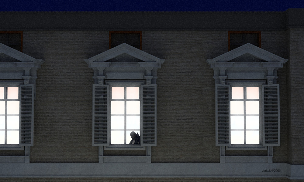 Aquí dejo una imagen a modo de homenaje al papa Juan Pablo i. Es una vista de las ventanas de la habitación del papa, las que al momento de su fallecimiento fueron cerradas y la luz se apagó. De manera de honrar su vida y legado, en el render las luces permanecerán encendidas como simbolismo a la presencia permanente que tendrá Juan Pablo en el corazón de todos los católicos y personas que lo consideraron un hombre de bien y paz.