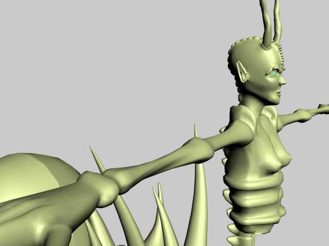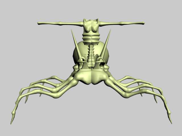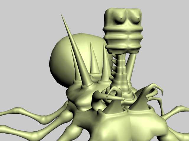 Con el modelado del rostro, queda claro que sígues sin hacer caso de la anatomía. Tu concepto no es malo, y de cierta forma está bien, pero cuando hagas caso de tomar referencias y apegarte a la anatomía, tus modelados van a ser mucho mejores, por muy alienígenas o infernales que estos sean. No va mal, y con una buena textura puede quedar mejor, pero creo que todavía tienes mucho que trabajar en el modelado. Saludos.