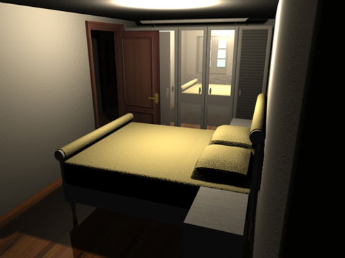 Eso si me tarda 50 minutos en calcular la radiosidad con un buen PC, no son los renders que veo por ahí, pero ya me sale algo más decente. Lo único igual la sombra de la cama en el suelo ¿no?