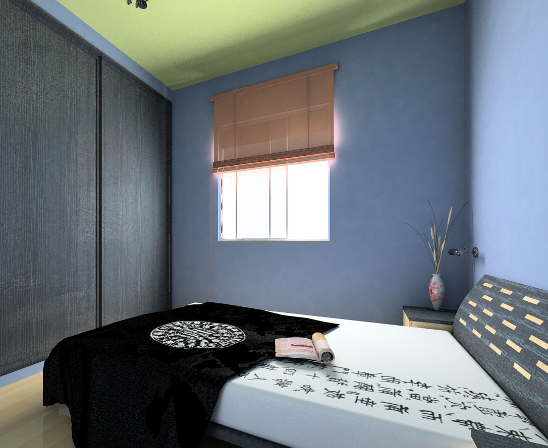 Lo más criticable desde el punto vista técnico es el mapeado de la madera teñida de azul, en el armario las vetas me parecen grandes en el cabecero enormes y en la mesas diminutas. La revista levita sobre las sabanas. El techo tiene Bump? Si no es así es posible que a la Vray lightde la ventana le falten samples. También veo un poco excesivo el color bleed del estor de la ventana sobre la pared. La tarima del suelo brilla un poco demasiado.