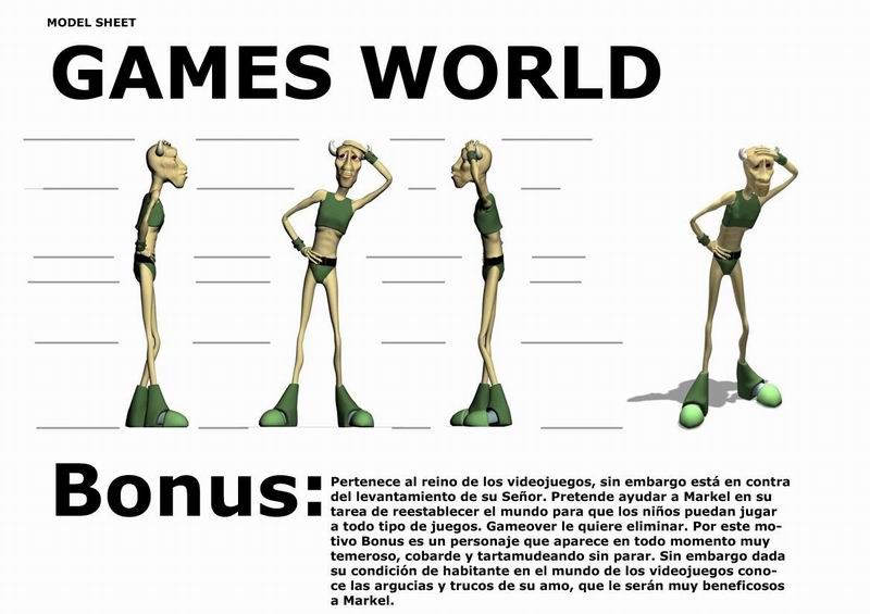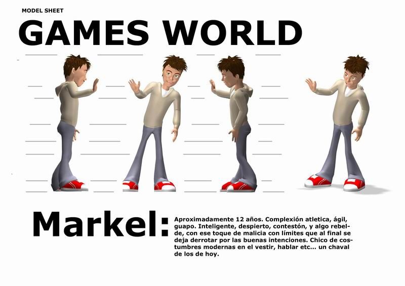 De que va el tema. A ve r si soy capaz de hacer una breve sinopsis así sobre la marcha. Markel es un niño vicioso de los videogames, un día al salir de clase se encuentra con un viejo, que le da un CD, un supuesto vídeo juego que le gustara mucho. Al llegar a casa se pone a jugar y al hacerlo se ve absorbido a un mundo extraño, es la antesala del mundo de los juegos games world. Allí encontrara a los tres duende disfrazados del viejo que le dio el CD, ellos le explican a Markel que el hada de la imaginación ha sido secuestrada por Gameover, que es el señor del reino de los videojuegos, también le explicaran que ha de liberar el mundo de los juegos de la fauces de Gameover, liberar al hada porque si no, solo existirá un juego: los vídeo juegos, la imaginación en los seres humanos desaparecerá, Markel comenzara una partida de videojuego, pues es la única forma de llegar hasta games world sin levantar sospechas, pero esta vez no será como en sus vídeo juegos, solo tendrá una vida, deberá recoger bolas de la imaginación ya que le darán fuerzas para que su barra de energía se mantenga al más alto nivel. Markel comenzará liberando el mundo de los dados, allí conocerá a bonus un renegado del reino de los vídeo juegos perseguido por Gameover y sus esbirros. Allí correrá mil aventuras, más o menos es eso.