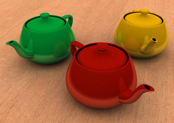 Podría alguien simular esta imagen con el Mental Ray del 3ds Max 7, es por simple curiosidad, la imagen es bien sencilla, tres teteras, una sola luz, nada de HDRI, suelo de madera, Mental Ray 2.1 standalone.