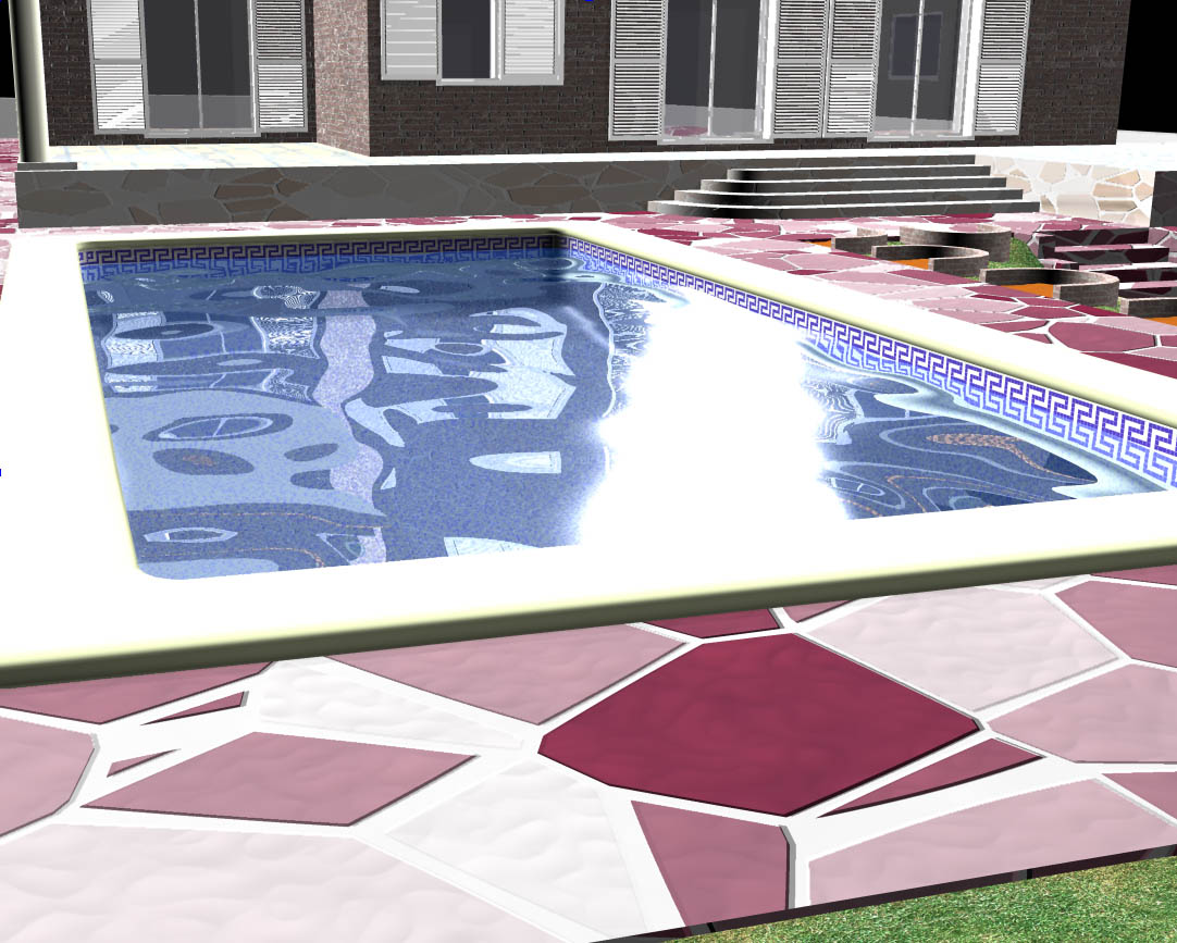 Un pequeño avance, el texturizado de la piscina, jodidas lositas. El suelo exterior es el estilo que buscaba, pero no consigo tener todas las losas del mismo color, lo hice con un flagestone. Me gustaría saber cómo ver el script del Shader a ver si puedo tocar algo para que me mantenga un solo color.