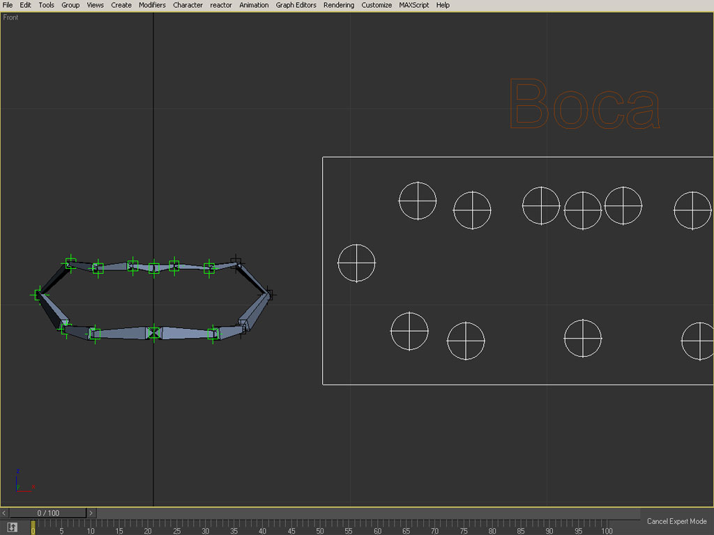 En la imagen 2 veis lo que llevo hecho hasta ahora. Curiosamente, el wired que le puse a la lengua, asociando un bend horizontal y uno vertical a los movimientos horizontales y verticales de la Spline, no me dió ningún problema, y funciona de miedo. Los ojos llevan un simple Look At orientado a las otras Splines, para que al moverlas, los ojos las sigan.