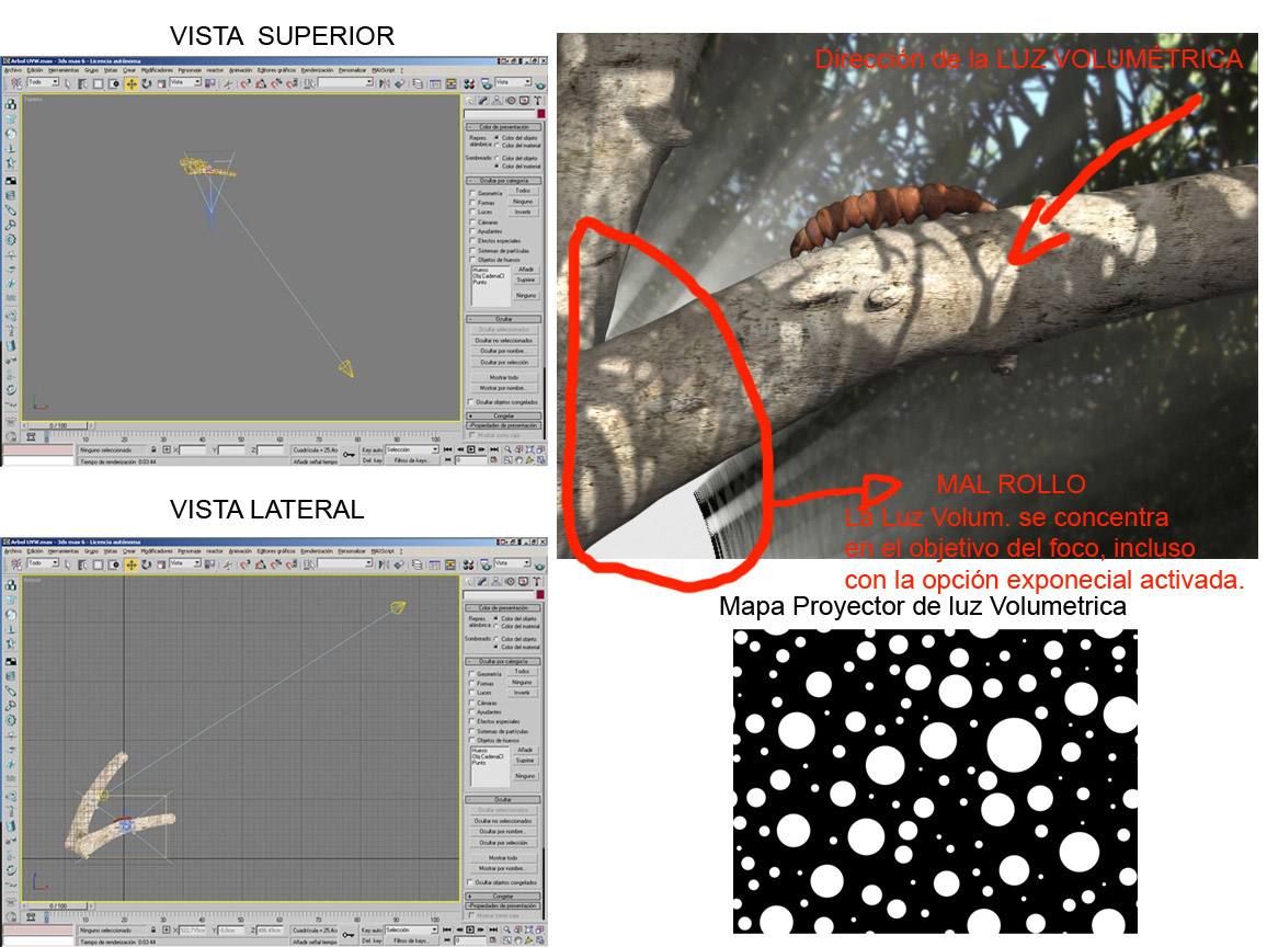 Hola aquí os dejo un trabajo que estoy haciendo y con el que me topado con un problema de iluminación, la escena postura 4 luces, una luz cenital, una tipo foco con objetivo que sería la principal, otra también tipo foco proyector con un mapa de bit para simular las sombras que se proyectan sobre las ramas y una última también de tipo foco proyector para simular un volumen luminoso, el problema viene con esta última y sucede que la luz volumétrica al llegar al objetivo del foco se hace más intensa en vez de disminuir con la distancia, da igual si utilizo un volumen luminoso exponencial, o los parámetros de atenuación del foco. Por si no me entienden les adjunto un archivo ilustrativo del problema.