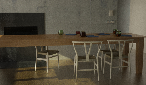 Mane162, hice varias pruebas rápidas sólo con la luz que hace de sol, pero el interior, renderizando con Low quality para ver el resultado de iluminación final, quedaba muy oscuro, demasiado. Probablemente, abriendo el diafragma lo hubiera solucionado, pero se me ocurrió más tarde es muy probable que se pudiera renderizar la escena en mucho menos tiempo, pero como decía Sokar, el tamaño de la imagen determina muy mucho el tiempo de render, imagino que de una manera similar al Quasi Monte Carlo de Vray. Si hubiera sacado este render a 500 por lo que sea, en un por favor es probable que estuviera hecho: a menos cantidad de píxeles, menos samples se necesitan para que tenga la misma cantidad de ruido, y menos ruido en la imagen al haber menos píxeles que calcular. Vaya, y skylight es skydome.