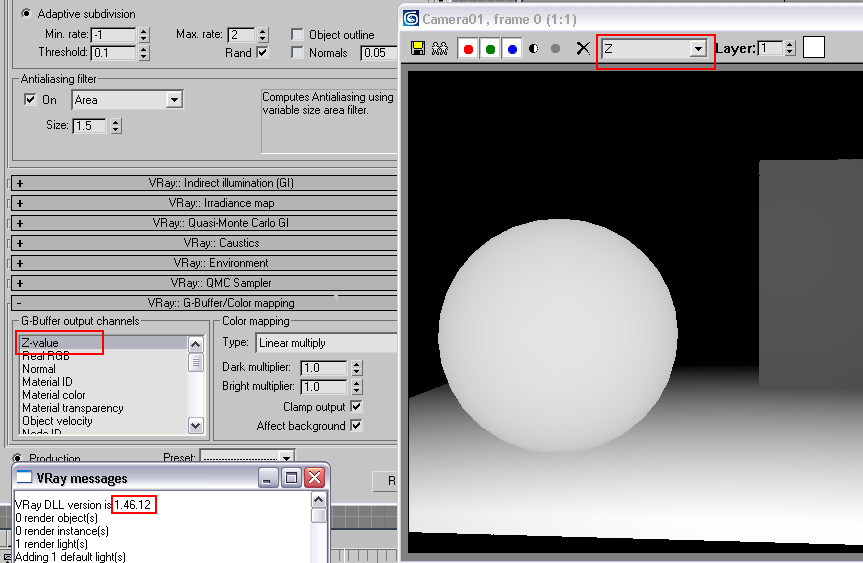 Ahora viene mi pregunta. Para sacar un render con Vray, en la pestaña G-Buffer/Color Mapping he seleccionado z-value. Pero cuando voy a renderizar no me sale en escala de grises.