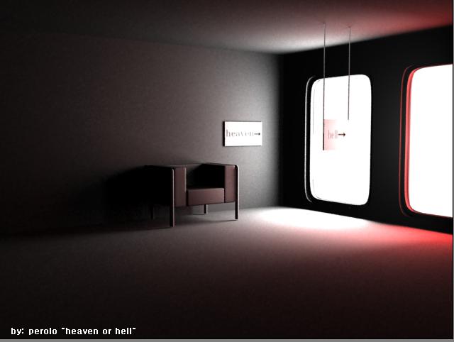 Me gusta mucho la idea, yo intentaría que se viesen mejor los carteles, se pierde un poco lo que pone, y también pondría el fondo de la puierte hacia el infierno de color rojo, se quedan las dos muy blancas. Un saludo.