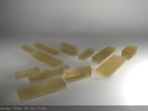 Como veréis el material es muy sencillo, en el Diffuse el color o mapa que queréis que tenga el material. En el refract un gris, que es el que controla la transparencia del material, y con el refract glossiness se controla el difuminado de la luz que pasa (y por tanto cuan borrosos se ven los objetos que hay detrás). El IOR a 1.01 (porque ha 1 falla en algunas versiones de Vray) para que no distorsione la luz demasiado. Y ya está.