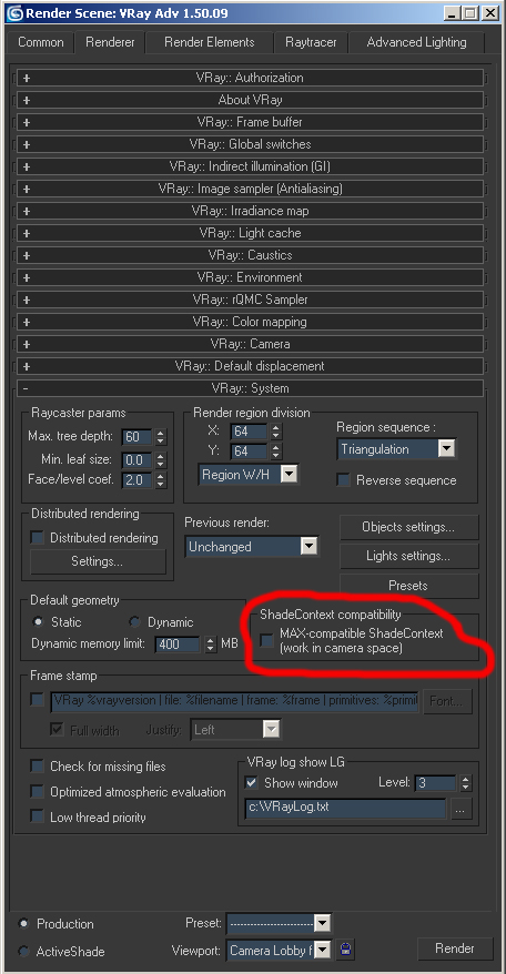 Saludos amigo fíjate que yo tengo Vray 1.50.sp2 en 3ds Max 2009 y no trae esa opción, pero si me da errores en verde.
