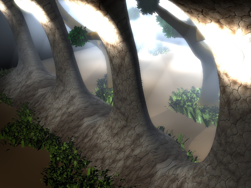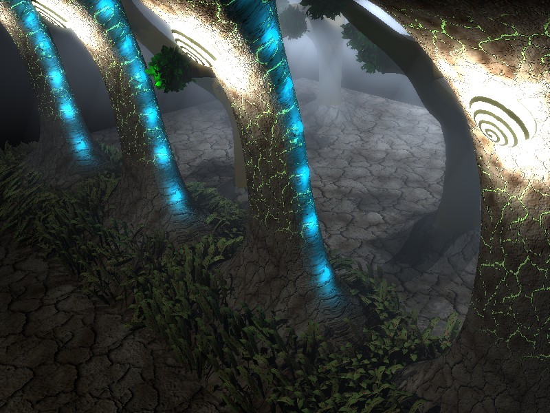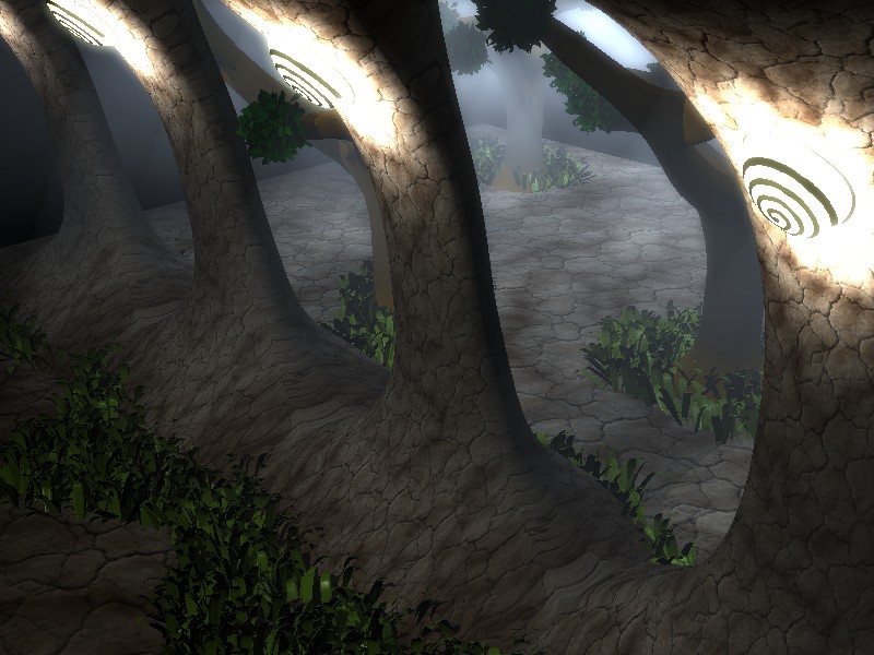 Ideas para el futuro: montón de plantas, arbustos, flores extravagantes, hierba, luciérnagas, plantas de agua con hojas exóticas, hiedra, lianas, luciérnagas gordas (insectos no terrestres) agua encharcada en el suelo, textura más saludable en el suelo, algo de ruido para simular montículos. ¿una madriguera quizá? Puertas bio-mecánicas.