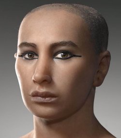 Hay algunas cosas más bastante mejorables, como la barbilla, los labios(sobre todo el superior), la nariz(que parece más un pico, y si te fijas en la recreación de Tutankamón que tú dices, esa nariz tiene mucha más fuerza). Saludos, y perdona por la guarrada de imagen.