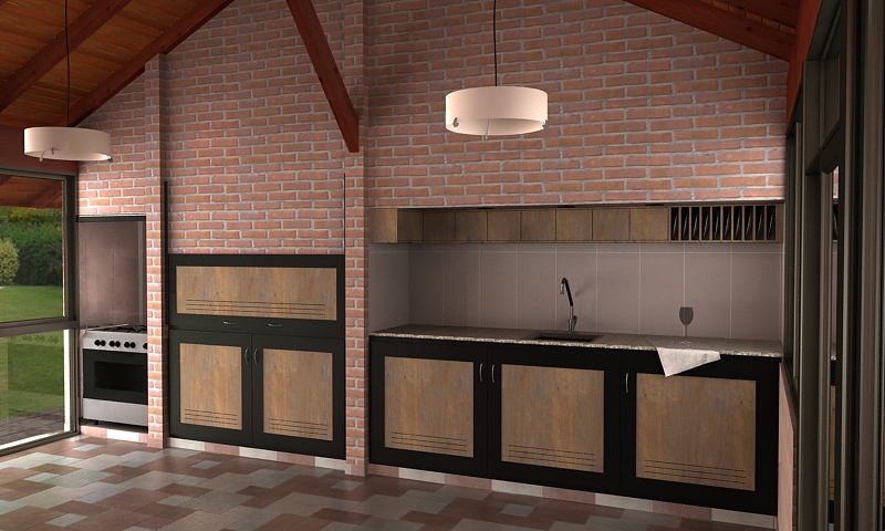 Darle más Bump a los ladrillos, que se note menos la repetición de las texturas de los muebles y darle más reflexión a las baldosas, acero (grifos y embellecedores del horno) y el suelo.