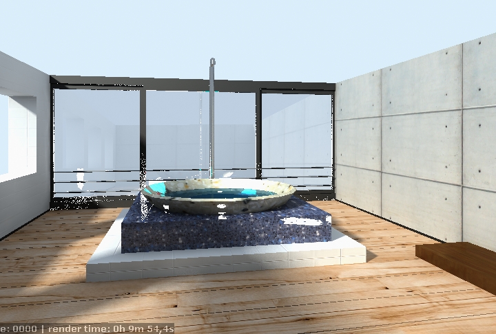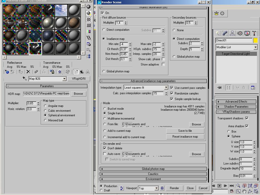 1er suceso: rendericé toda mi escena con materiales asignados, salvo por el duchero (olvidé asignarle su mat), salió todo bien y guardé el mapa de irradiance (imagen 1).