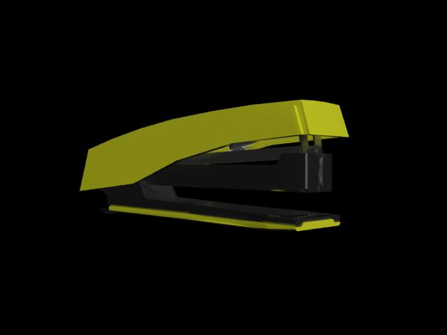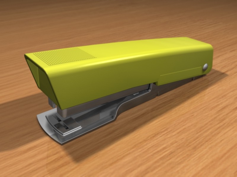 Tocaría un poco el material metálico para que pareciese más cromado. También trabajaría la textura del plástico amarillo para poner la marca de la grapadora, letritas y esas cosas, y tocaría un poco el especular para que tuviese algún brillo (si quieres hacerla de un material mate, entonces nada).