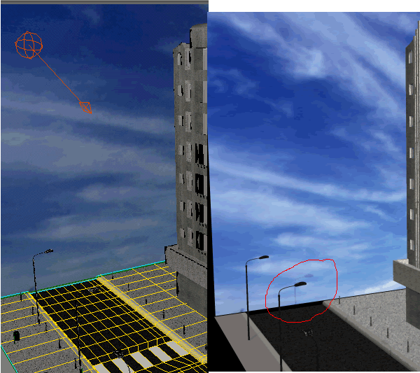 2- Escena con dos luces, una infinita con sombras RayTrace y una puntual sin sombras, la principal es la que se en la imagen de la izquierda, al infinita que incide lateralmete en las farolas, unas sombras se proyectan sobre el suelo y otra, la última de la acera sobre el cielo que es un grid con un bitmap como textura, un material Lambert sin activar reflejos, translucido, transparencia, nada, solo bitmap y proyección.