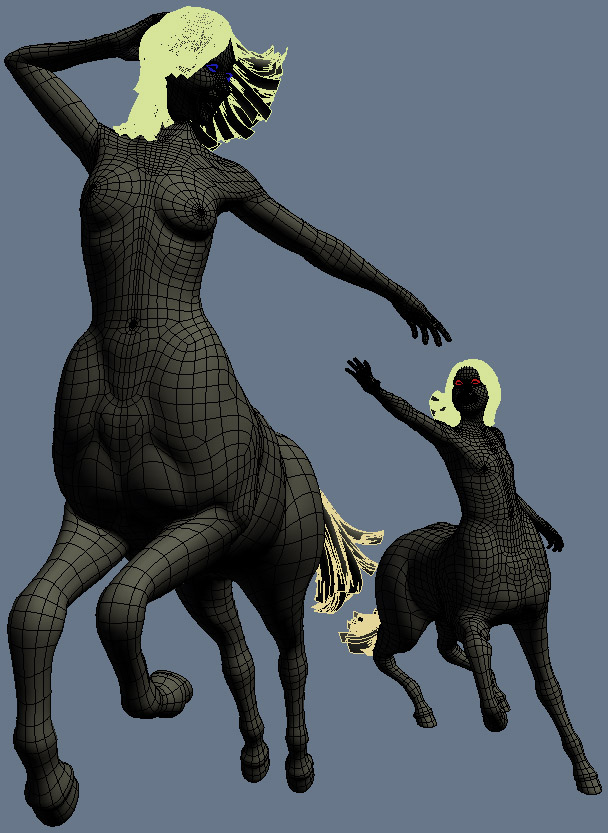 Pfiu, muy buena imagen, lo que más me gusta, la expresión de ambas y el Shader de la piel humana, me gusta mucho sólo le falta un poco de bello fino, lo que menos:las patas de las centauras, en comparación a los torsos les falta detalle, y la textura tampoco me mata. Estoy de acuerdo con Daniel en lo del hombro, pero repito que me gusta mucho.