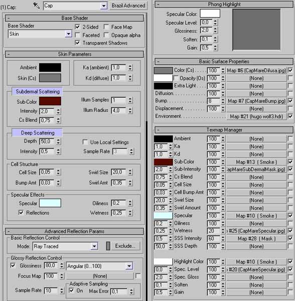 Repe -> gracias. Si, me cogieron la ninfa para el libro. Es curioso, hoy mismo me han dicho que me lo han mandado. S0ny -> pues mira, tenía por ahí el Shader en una imagen, te lo adjunto. Pasa que está hecho con Brazil, depende de con que estés renderizando no te va a servir. A parte de eso depende de cómo hagas las texturas. Yo personalmente uso siempre fotografías reales como base y luego las voy modificando según me interesa. Echaré un ojo ahora a los trabajos en proceso a ver si la tienes por ahí y ver si puedo hacerte una crítica más personalizada.