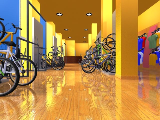Hola, esto trabajando en este render de una tienda de bicis, pero tengo el mismo problema que siempre, el techo sale muy oscuro, me gustaría recibir ideas para poder aclararlo de una forma natural sin que el resto del render se vea afectado, y como tiene muchos polígonos intentando minimizar su impacto en el render.