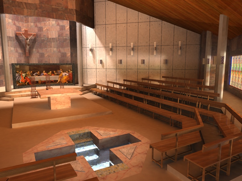 Particularmente me parece que la última cena canta como dicen muchos aquí y es sencillamente porque contratasta demasiado con un estilo totalmente diferente de arquitectura, de hecho, el conjunto de volumen está bien logrado, dado que rescata la condición minimalista de las primeras iglesias (sin tanto cuadro, vitral o adorno) y simplifica la simbolización de lo que realmente importa en el catolicismo, el bautizo, la cruz y la congregación en torno a los dos pilares fundamentales de la iglesia, el resto es adorno y relleno.