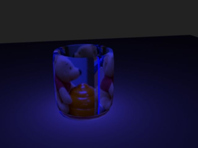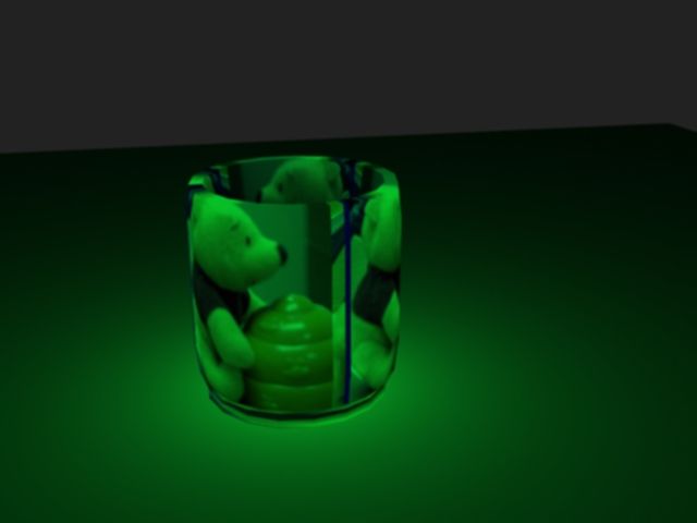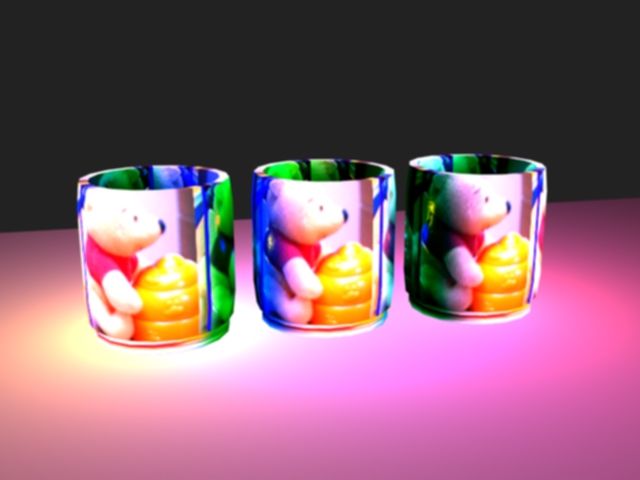 He aquí unas pruebas de este shader. Una luz por vaso, con distinto color.