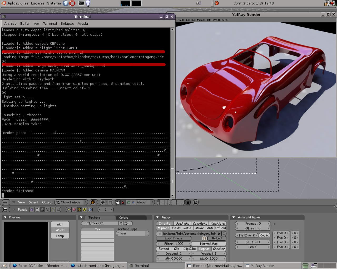 Luego en texture buttons tengo cargado el, HDR como image, el Yafray lo tengo en full, pero sin caché ni photonoes y el reflejo de la carrocería es un Fresnel reflect / Ray Mirror.