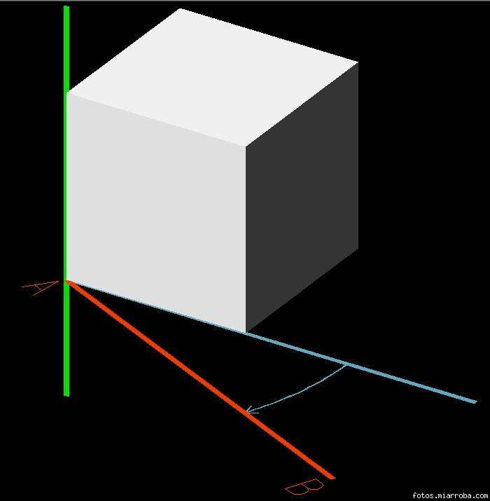 Otra forma de utilizar el comando gira, es combinándolo con los SCP (sistemas de coordenadas personales). En el caso que nos planteaba Pepe Zafra y suponiendo que la línea azul y la línea rojo no tuvieran el punto de convergencia coincidente en a, sino que estuviesen separadas y suponiendo que la línea azul estuviese alineada con el SCU (sistema de coordenadas universal) y el origen estuviera en el punto a y el extremo derecho de la línea apuntase exactamente hacia los 0º (cero grados) y quisiéramos alinear el cubo con la línea roja, la cual desconocemos su ángulo, yo usaría el SCP, opción objeto, al usar esta opción, AutoCAD te pide que designes el objeto, en este caso se debería tocar a la línea roja en su extremo izquierdo, hecho esto, el SCP, se girara y se alineara con la línea roja, estando los (cero grados) a la derecha de la línea roja y los 180 grados a la izquierda, (si tocasemos a la línea roja en su extremo derecho, los 0º estarían a la izquierda y los 180 grados a la derecha, los 90 grados estarían abajo y los 270º arriba). Ahora, ejecutaríamos el comando gira para rotar el cubo (que es la pieza que nos interesa) seleccionamos la opción referencia, nos pide el ángulo de referencia, picamos en el extremo izquierdo de la línea azul o esquina inferior izquierda del cubo y el segundo punto lo picamos en el punto final de la línea a la derecha o la esquina inferior derecha del cubo y a la siguiente pregunta que es la del nuevo ángulo contestaríamos teclando 0 (cero). Habremos alineado el cubo con la línea roja, sin mover su esquina inferior izquierda del lugar que ocupa originalmente.