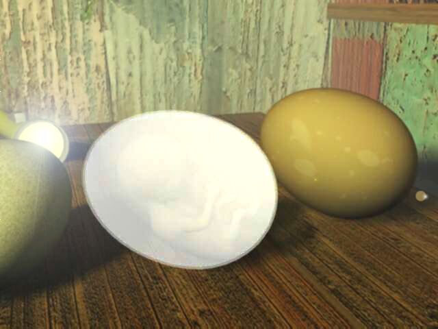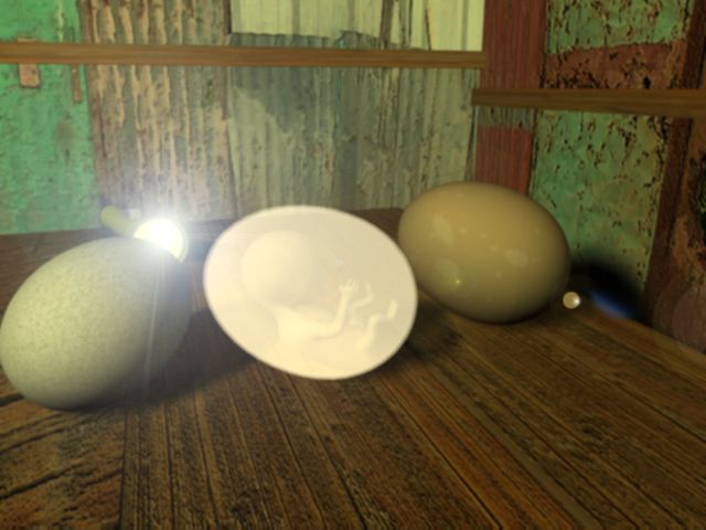 Si la escena fuera algo rollito Matrix o Neuromante (más oscura, neones) en vez de una habitación en el chalet de la montaña creo que ganará. La textura de las paredes me gusta cómo queda: le da un aspecto de cobertizo podrido que molan (si lo que querías era hacer una habitación nupcial, creo que meto la gamba), y una cosa que me resulta curiosa es que la única fuente de luz tangible de la escena, la linterna, no arroje sombras, y creo que ni siquiera participa de la iluminación de la escena. Creo ver que has añadido un destello o Lens flare en postproducción, cosa que da a entender que la linterna está encendida, ¿no? Mi consejo es que revises ese pequeño detalle, aparte de todo esto, la imagen me da un mal que no veas, eso de un feto dentro de un huevo no me evoca ideas felices precisamente. Un saludo.